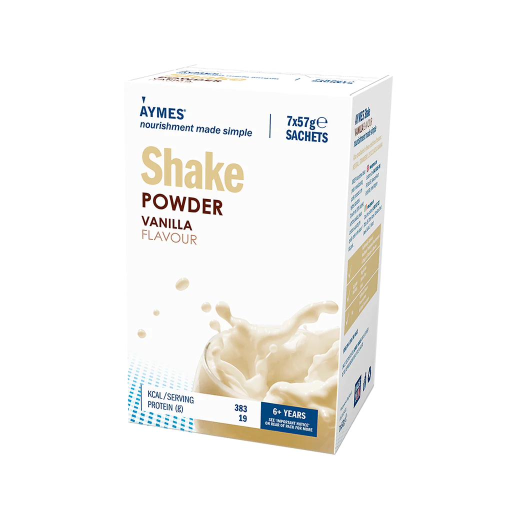 Aymes Shake is a powder, based on skimmed milk powder with added carbohydrate, fat, vitamins and minerals, which provides a nutritionally balanced meal in a drink, supplement / sip feed when reconstituted with water or whole milk.
